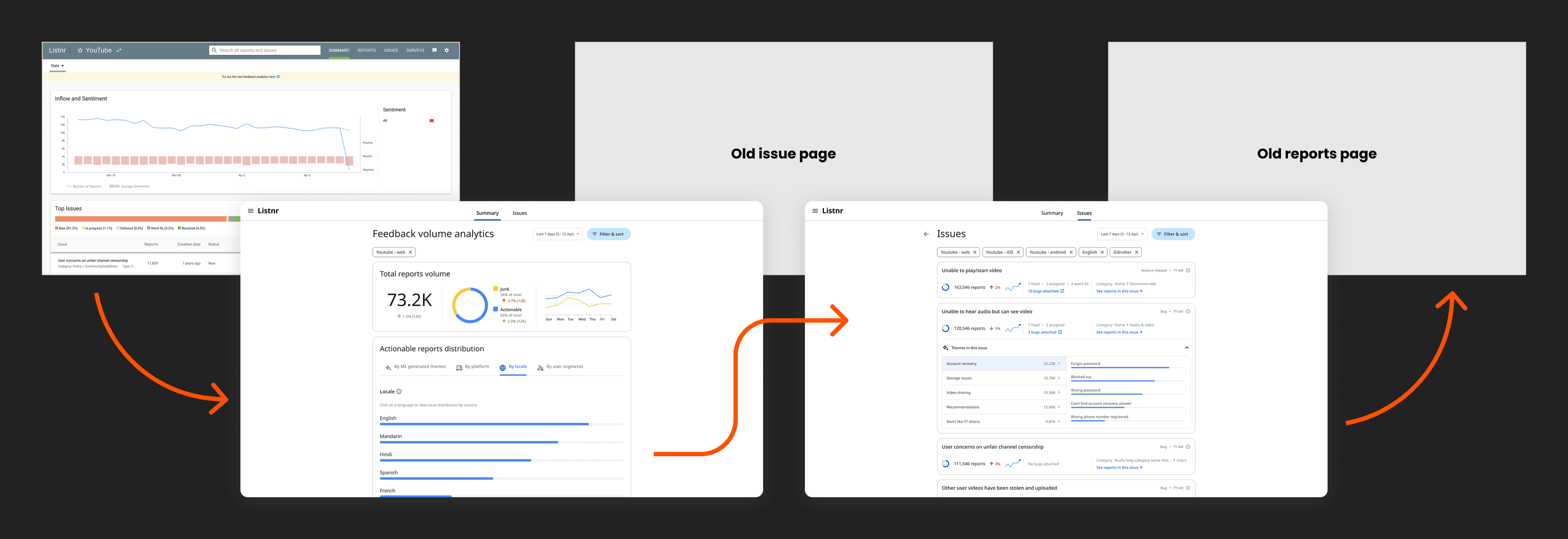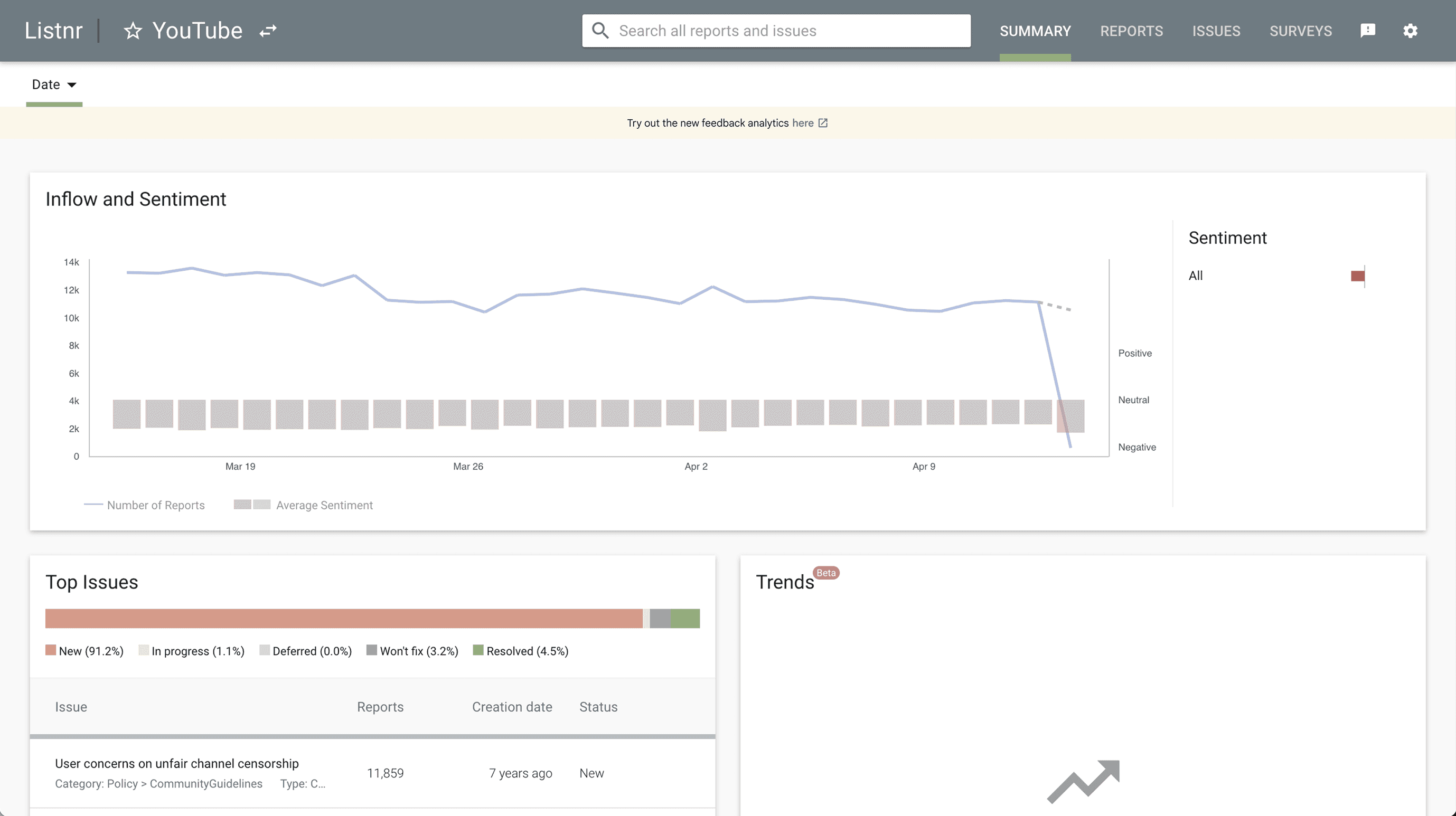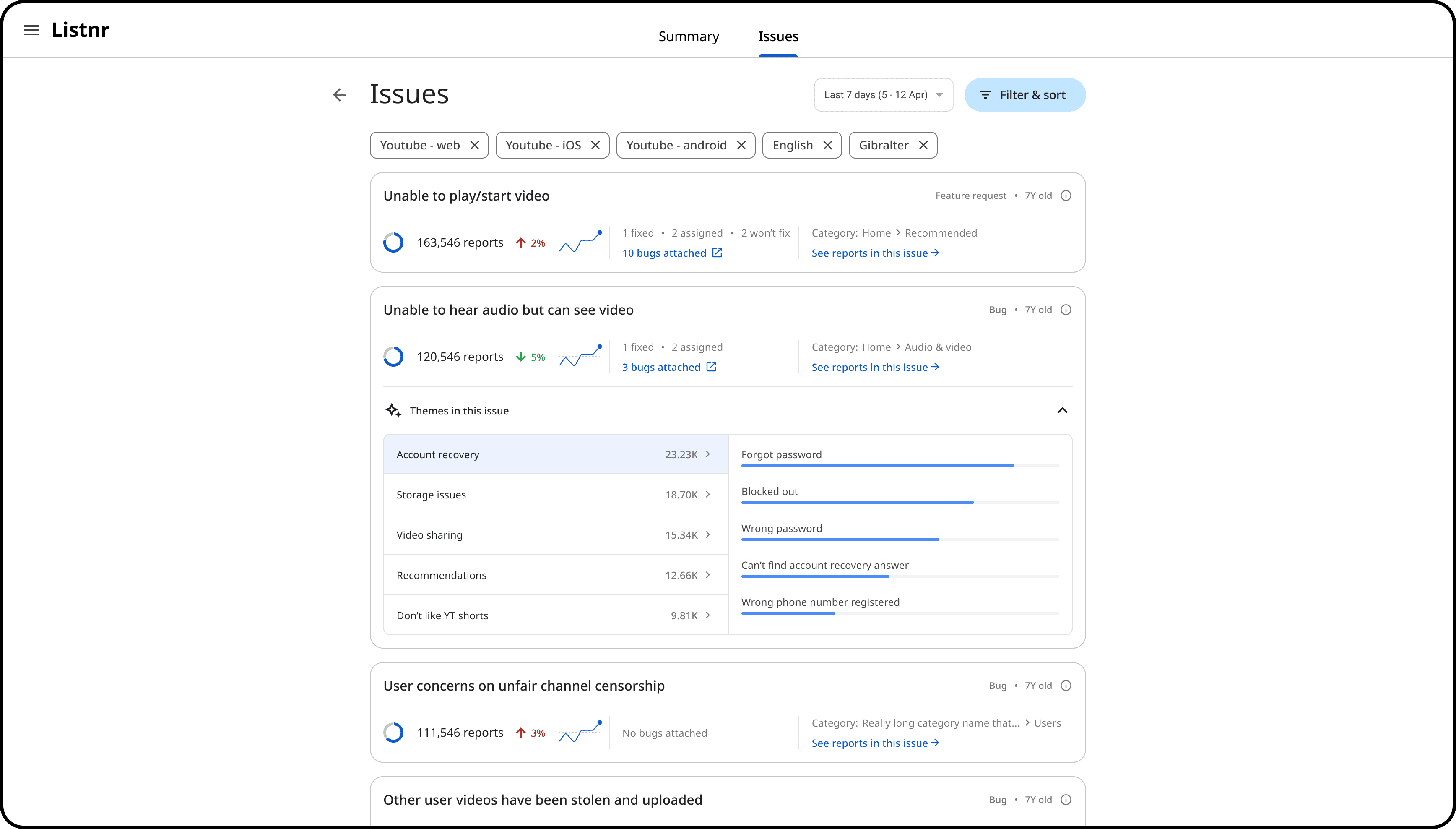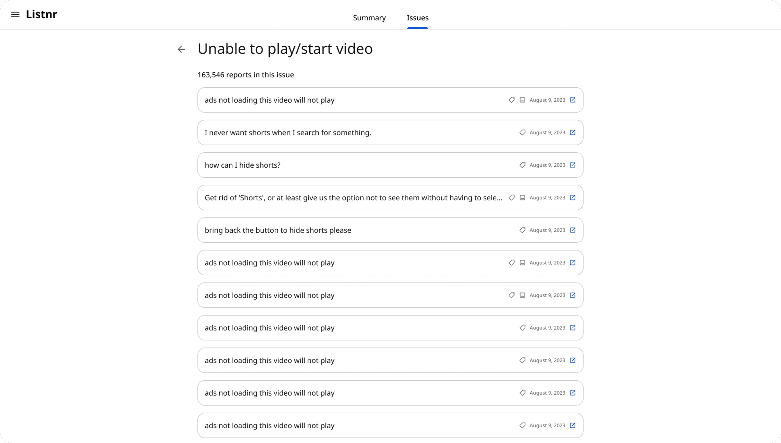 Listnr is used by multiple product teams at Google to triage and analyze incoming feedback, create bugs, and take action.