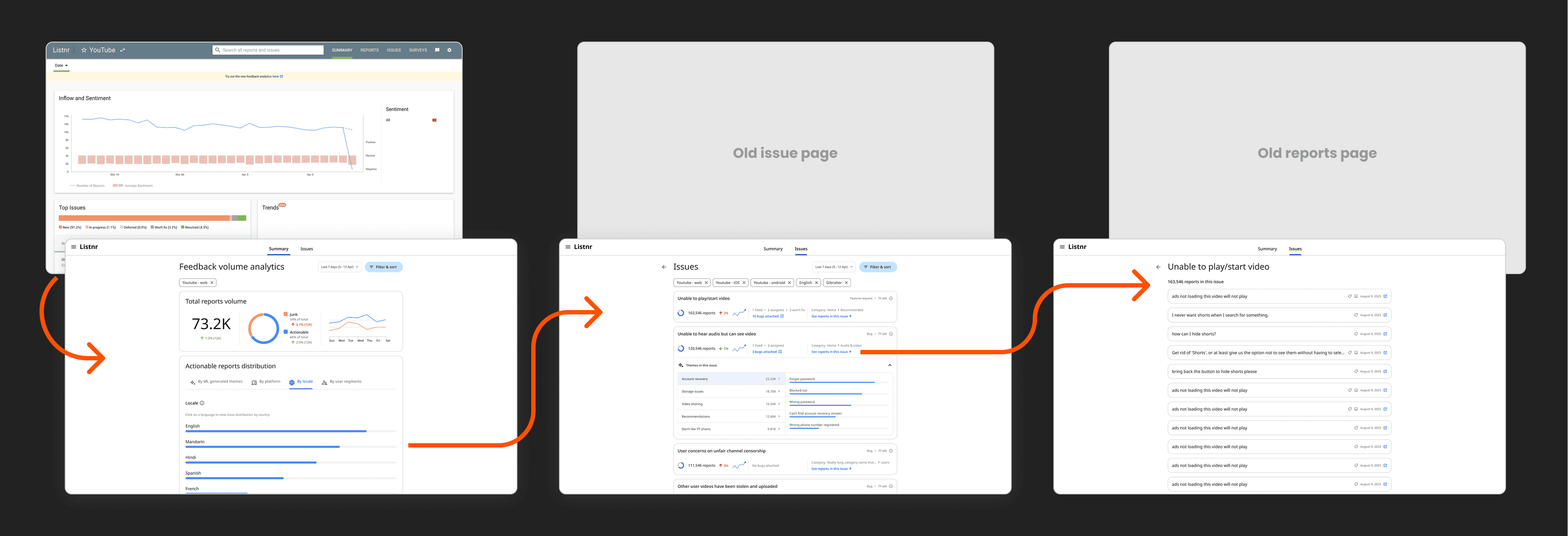 The new Issues page could be accessed either through the primary navigation or by drilling down directly from a chart on the landing page. It introduced advanced filtering, improved visualizations, and AI-generated themes to support deeper exploration and faster prioritization.