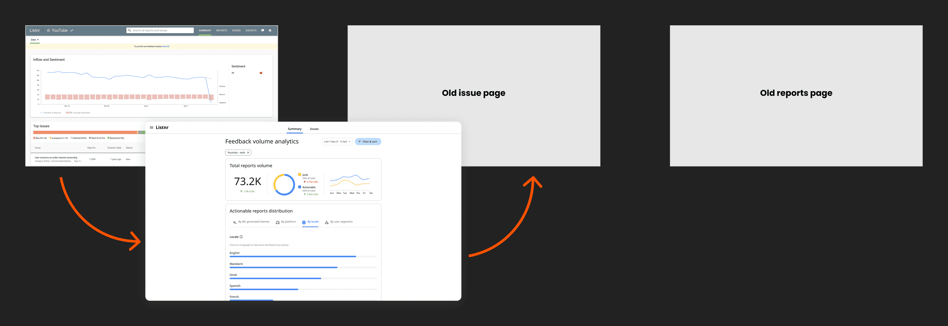 The new landing page presented overall feedback volume within a selected date range, categorizing it into actionable vs. junk feedback. Historical data was layered in to help teams identify spikes and anomalies over time.